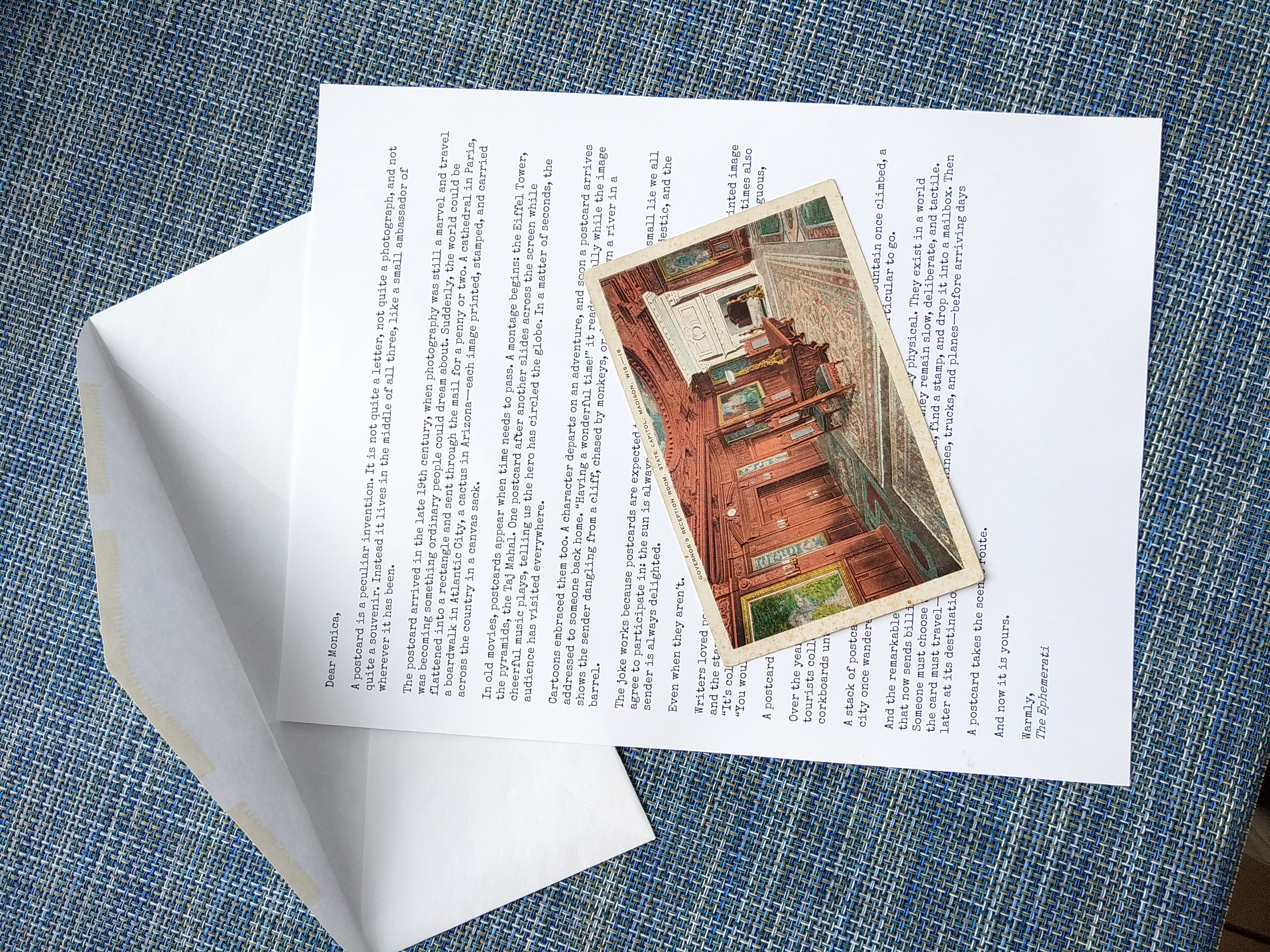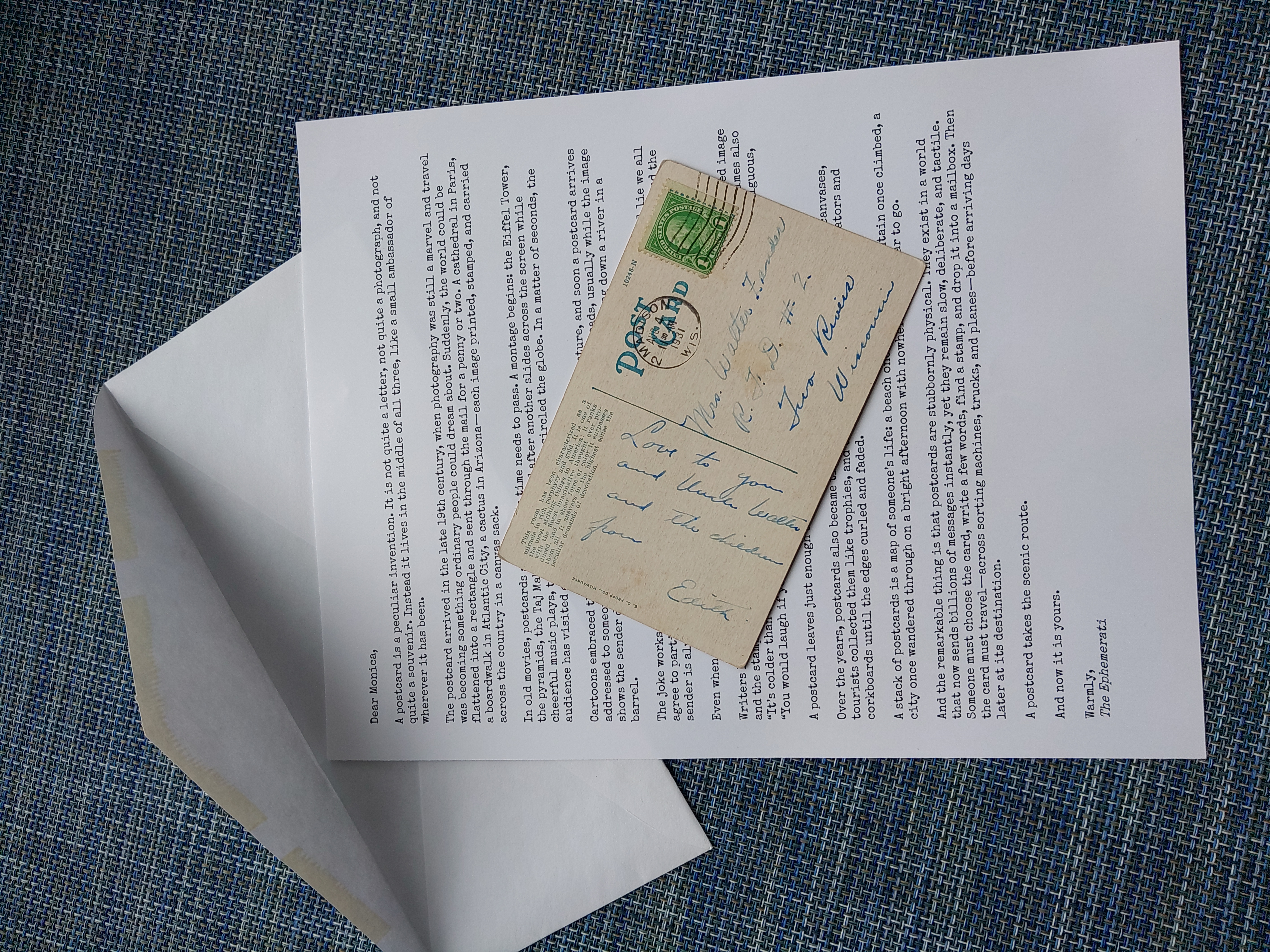 A monthly mailing drawn from the Ephemerati vault: usually some combination of printed ephemera plus a short letter/essay/story.